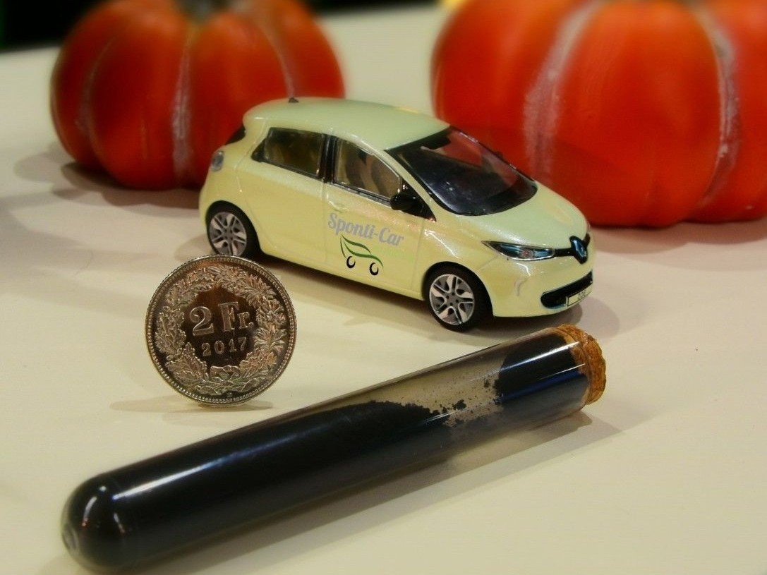Et maintenant, place au suspense : pour montrer combien de CO₂ est économisé grâce à Sponti-Car, nous avons rempli une éprouvette de « charbon » – celle-ci symbolise des kilomètres en voiture à énergie fossile économisés. Mais combien de kilomètres se cachent réellement dans cette éprouvette ?