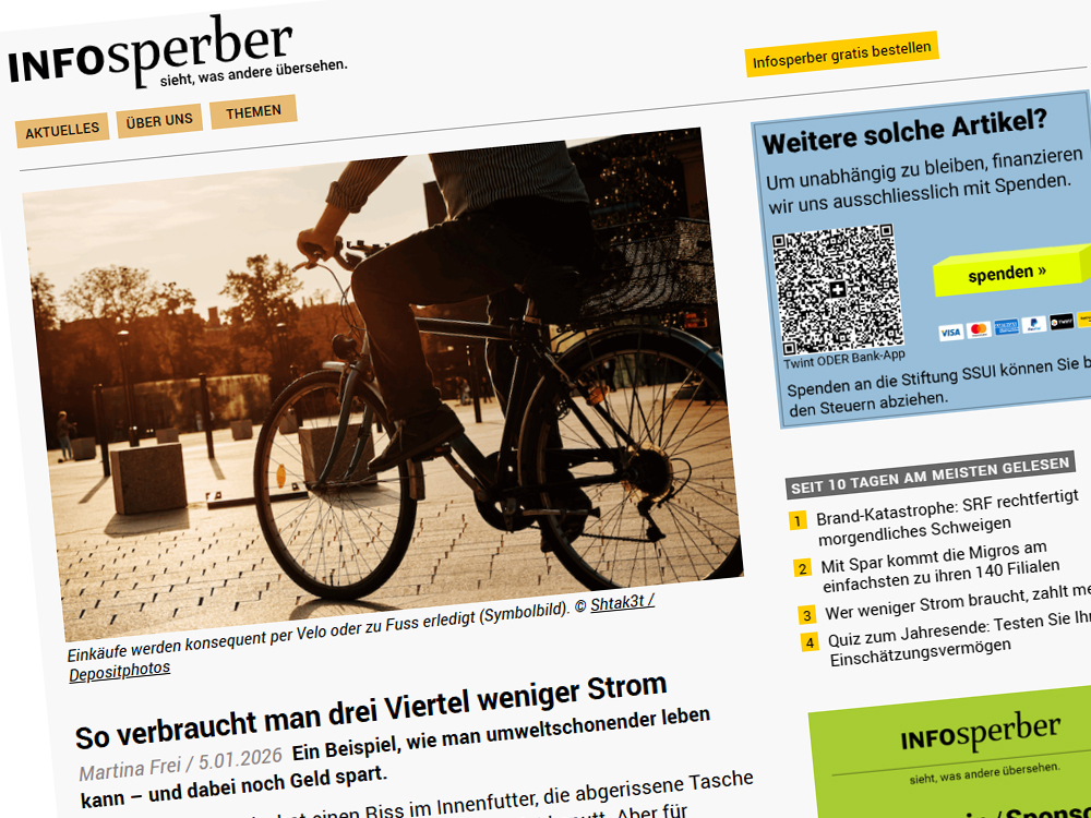 Das Verhalten eines «Herrn Müller» präsentiert Infosperber als «ein Beispiel, wie man umweltschonender leben kann – und dabei noch Geld spart». Besagter Herr trägt die zerrissene Jacke weiter für die Gartenarbeit. Kleider kauft er in der Brockenstube, flicken lässt er sie im Reparatur-Café. Im Haus dauert seine Heizperiode von Dezember bis Februar, beheizt wird nur jeweils der Raum, in dem er sich aufhält, und auch dieser nur mit 14 Grad. Und so weiter. Man darf sich fragen, ob dieses angestrengt asketische Leben unter der Devise der Suffizienz in einer freiheitlichen Gesellschaft wirklich massentauglich ist. Und was mit der Gesellschaft geschehen würde, wenn wirklich alle so, oder so ähnlich, handeln würden.