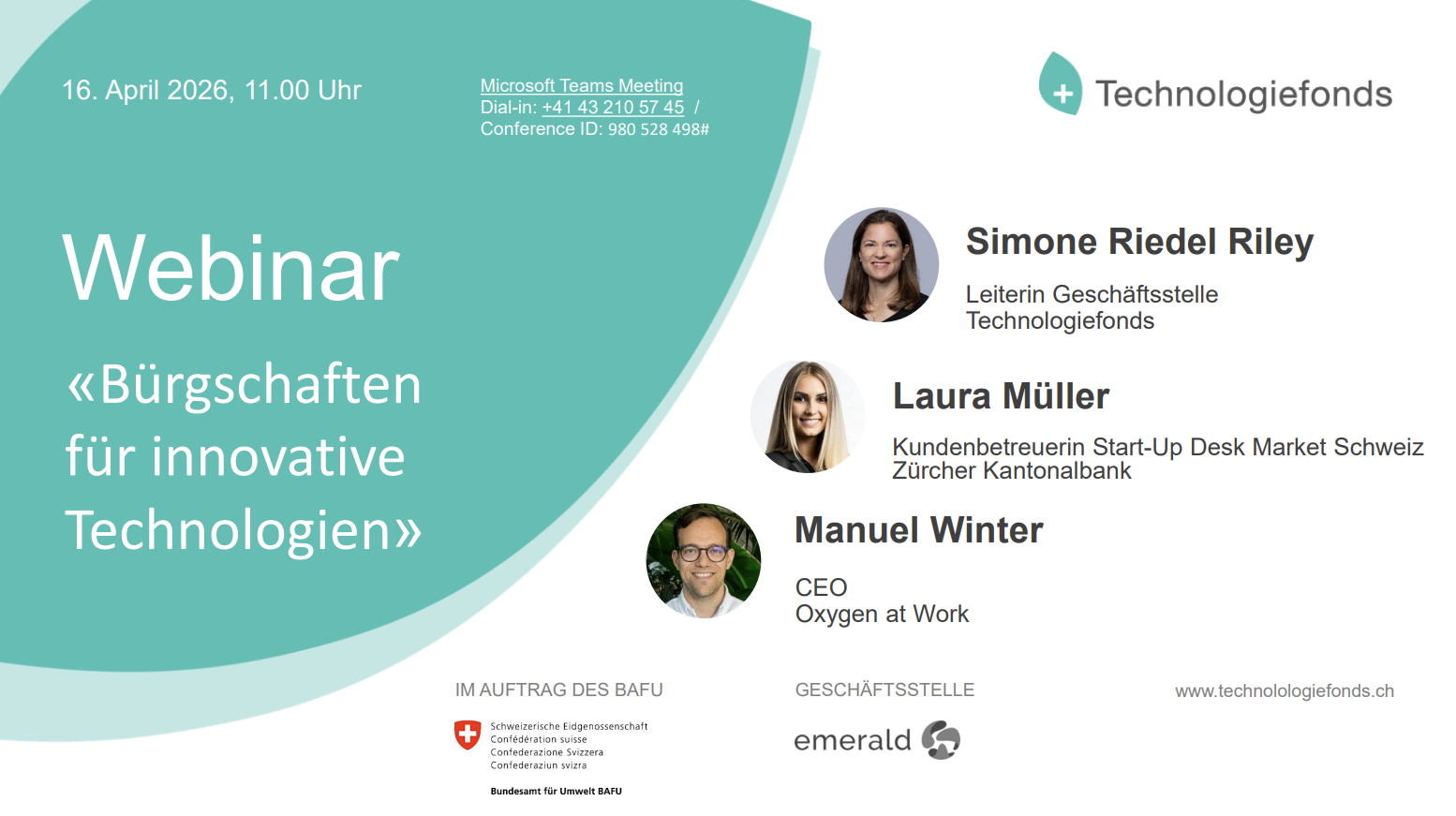 Im Webinar «Bürgschaften für innovative Technologien» am 16. April 2026 um 11:00 Uhr erhalten Teilnehmende einen Überblick über das Instrument der Bürgschaft und dessen Bedeutung für wachstumsorientierte Unternehmen. Referent:innen aus Förderpraxis, Finanzierungsumfeld und Unternehmersicht teilen ihre Perspektiven und ordnen ein, wie Bürgschaften in eine nachhaltige Finanzierungsstrategie eingebettet werden können.