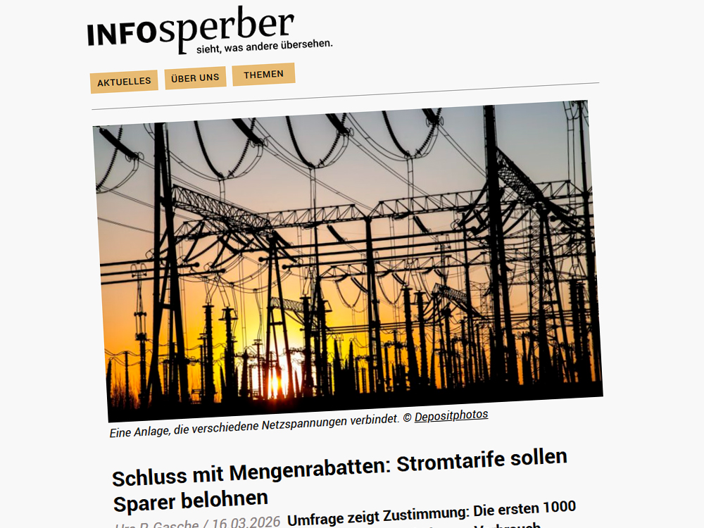Die Forderung nach einer Progression bei den Stromtarifen finde Anklang, meldet die Informationsplattform Infosperber. Sie beruft sich auf eine repräsentative Meinungsumfrage von Demoscope, die sie selbst in Auftrag gegeben hatte.