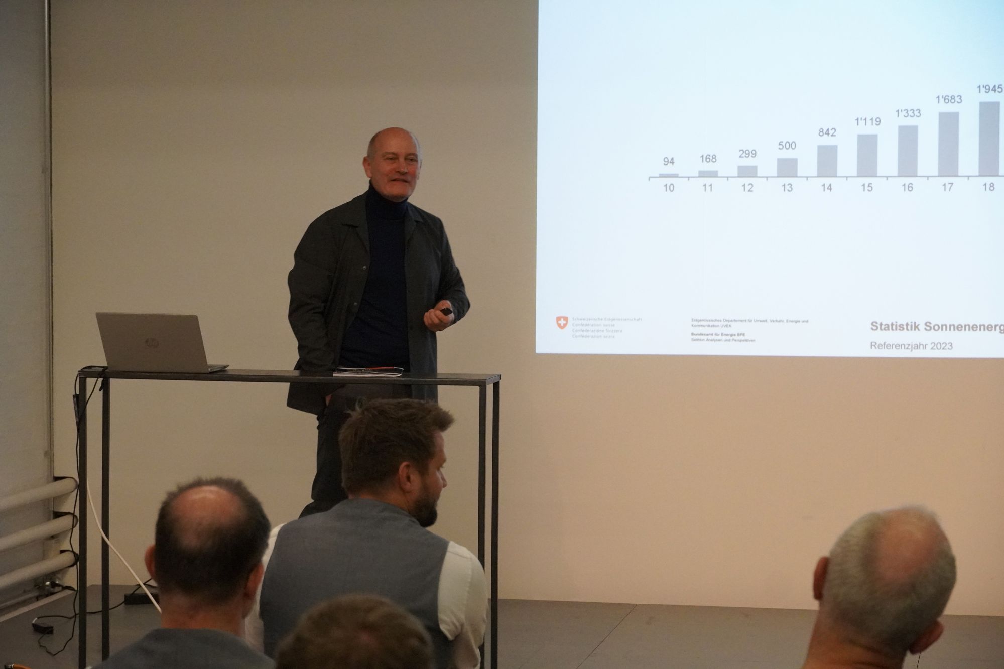 Im Anschluss sprach Daniel Studer (ETH Zürich) über die «sonnigen Aussichten» einer solar geprägten Zukunft. Er machte deutlich, dass architektonische Ästhetik und Energieproduktion längst kein Widerspruch mehr sind, sondern ein integraler Bestandteil moderner Baukultur. Dazu präsentierte er verschiedenste Formen und Arten von PV-Lösungen wie Balkonelementen, Faltdächer, bewegliche Elemente oder Vorrichtungen für Fenster und Fassaden.