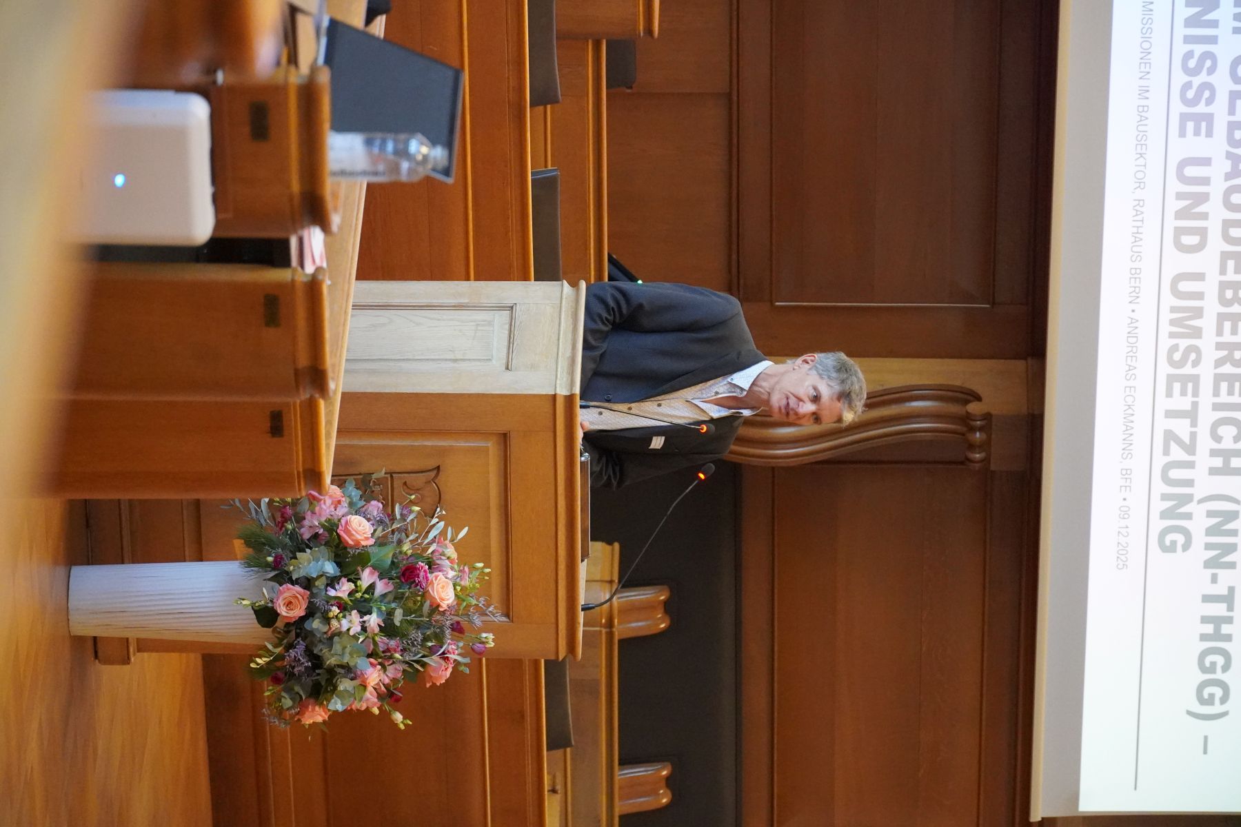 Am 9. Dezember 2025 fand im Rathaus Bern das 3. Symposium «Graue Emissionen im Bausektor» statt. Diverse Fachpersonen aus Verwaltung, Architektur, Planung, Bauwirtschaft, Forschung und Politik folgten der Einladung und nutzten die Gelegenheit, sich über aktuelle Entwicklungen, Herausforderungen und Lösungsansätze zur Reduktion grauer Emissionen auszutauschen.